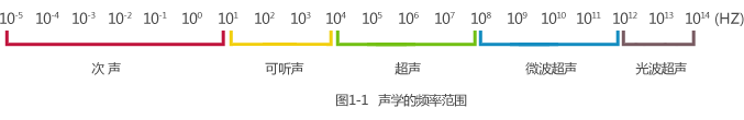 超聲波是指頻率高于人耳聽覺上限的聲波。一般來說,正常人聽覺的頻率上限在16-20KHZ之間,隨年齡、健康狀況等有所不同。值得注意的是,人們習(xí)慣上常把以工程應(yīng)用為目的,而不是以聽覺為目的的某些可聽聲帶的應(yīng)用亦列入超聲技術(shù)的研究范圍,因此,在實際應(yīng)用中,有些超聲技術(shù)使用的頻率可能在16KHZ以下,而超聲波頻率的上限是1014 HZ,整個頻率范圍是相當(dāng)寬廣的,如圖1-1所示。