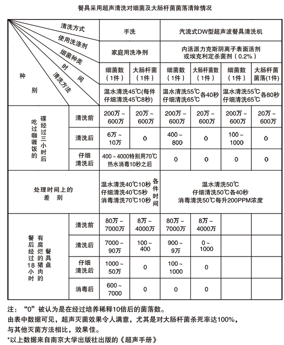 超聲滅菌的研究已延續(xù)了半個多世紀(jì),其中包括超聲對傷寒桿菌、葡萄球菌、部分鏈球及大腸桿菌等殺傷的研究。研究表明,超聲對細菌的殺傷作用不僅與超聲強度、頻率、作用時間有關(guān)、還與細菌懸浮液的濃度有關(guān)。利用超聲餐具清洗機,清洗餐具上細菌及大腸桿菌的情況見下表。