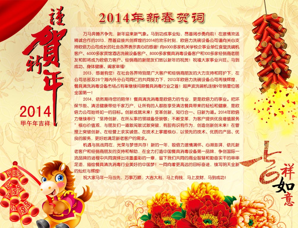 餐具清洗消毒是歐倍力洗碗機公司的專業(yè),做較好的洗碗機,指引餐具清洗消毒市場是歐倍力追求的目標(biāo),在馬年來臨之際,歐倍力公司及全體員工祝大家馬年吉祥,萬事順心!