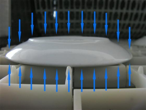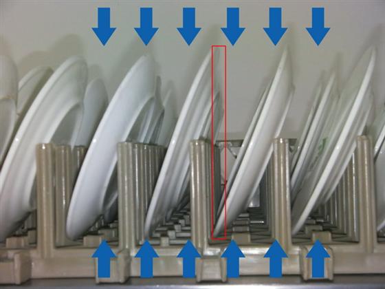 關(guān)鍵的是斜插式的洗碗機傳送,在洗碗機清洗過程中存在較大的弊端,斜插于籃筐(傳送帶)上會因為其本身的形狀造成一個清洗死角,導(dǎo)致餐具清洗不干凈。如下圖示。所以在業(yè)內(nèi)不公開的秘密,因清洗質(zhì)量存在缺陷,用在不太重要的客戶場所,象重要的大型學(xué)院、合資公司、高級酒店等已逐步不再采用。